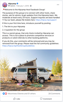 Grew the Hipcamp community and social media from the ground up. Created Hipcamp voice & tone guidelines, managed Wordpress developer, CMS migration & design, collaborated on creation of Hipcamp Values. Founded the Hipcamp Host community, including the Hipcamp Host Facebook Group, and Hipcamp Host interview series. Grew Instagram audience from 8k-100k in the first year through partnerships, and user-contributed content.